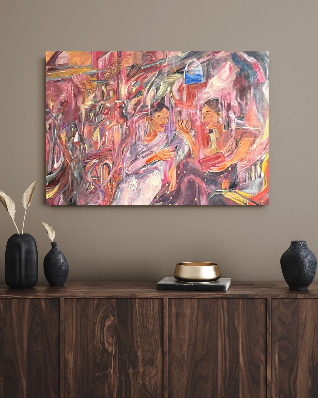 In this energetic, gestural piece a dynamic duo talks animatedly in the New York City subway in the 1970s. Or are they on the London tube in the present day? Could they be on a railroad in Mumbai, in 2050? The painting is an ode to the gorgeous messiness of big cities, the timelessness of cultural exchange, and to meaningful encounters in the heart of the metropolis.